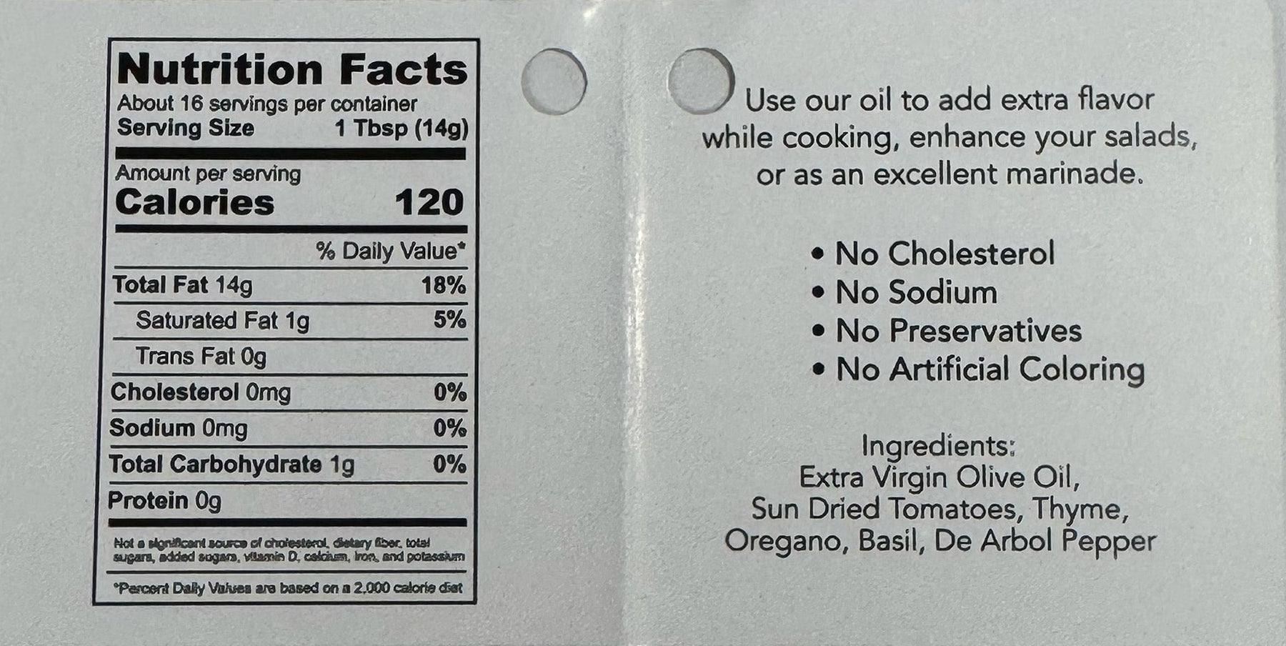 Transport your taste buds to the heart of Italy with Olive Pit’s Italiano Dipping Oil. Crafted with premium Extra Virgin Olive Oil (EVOO) and a bold blend of Mediterranean herbs and spices, this gourmet infusion features sun-dried tomatoes, rosemary, thyme, oregano, basil, and a touch of De Arbol pepper for a subtle kick of heat.