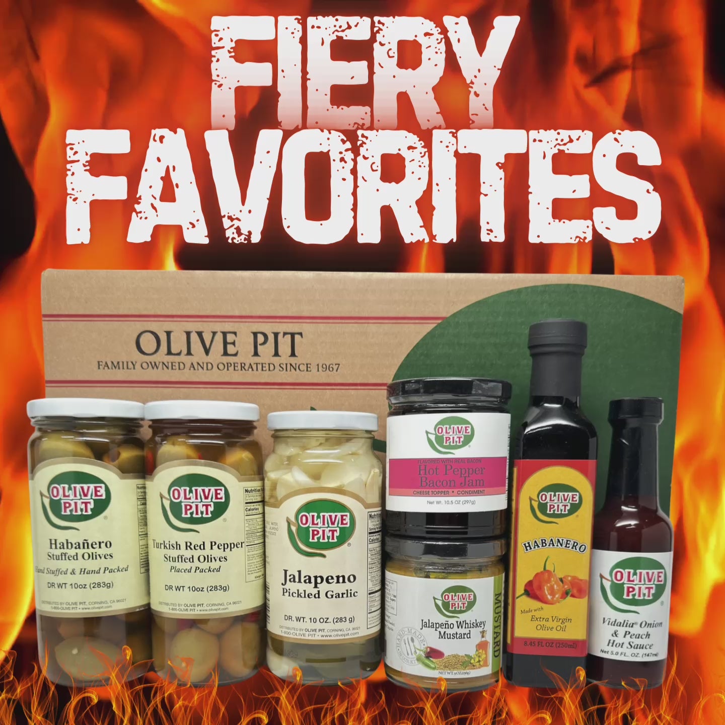 Includes: Habanero Stuffed Olives Pint, Turkish Red Hot Pepper Stuffed Pint, Jalapeno Garlic Pint, Hot Pepper Bacon Jam 10.5oz, Jalapeno Whiskey Mustard 9oz, Habanero Extra Virgin Olive Oil, Vidalia Onion & Peach Hot Sauce 5oz.