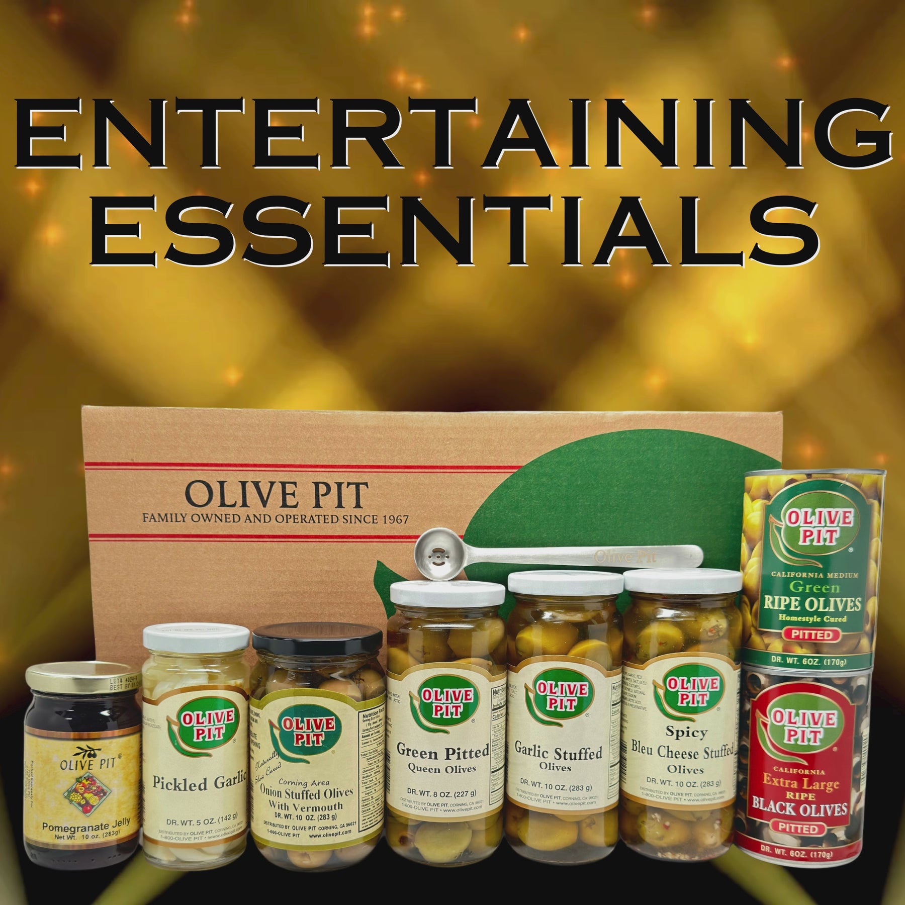 Includes: Spicy Bleu Cheese Stuffed Olives Pint, Garlic Stuffed Olives Pint, Green Pitted Queen Olives Pint, Corning Area Onion Stuffed Olives with Vermouth Pint, *Regular Pickled Garlic 1/2 Pint, Pomegranate Jelly 10 oz., Black Ripe Olives #300 can, Green Ripe Olives #300 can, and Olive spoon - Stainless Steel.