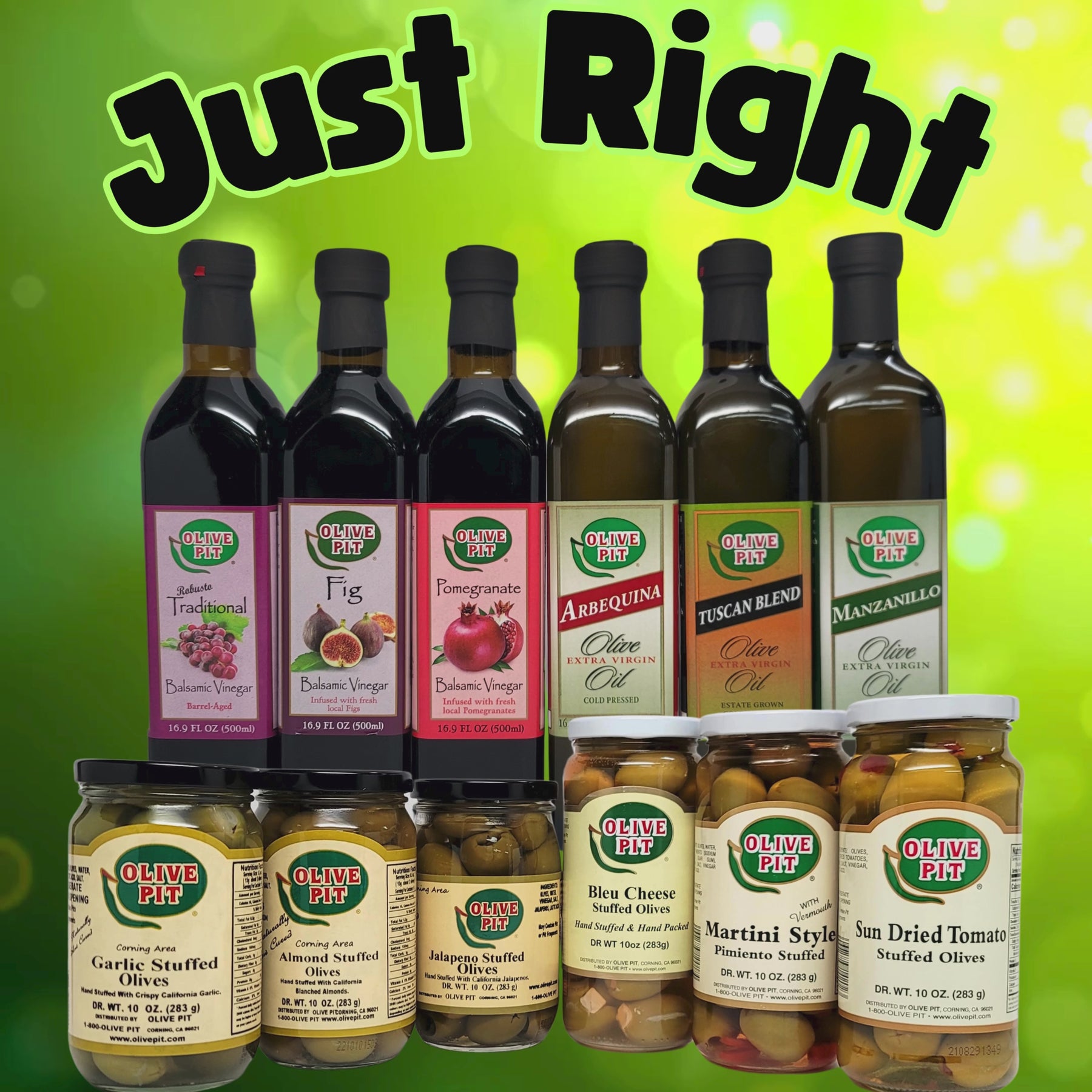 Just Right Gift Box is a great medley of our Stuffed Olives, Oils & Vinegar. This pack includes: 6 pints of our delicious stuffed olives: Corning Area Garlic Stuffed, Corning Area Almond Stuffed, Corning Area jalapeño Stuffed, Bleu Cheese Stuffed, Martini Stuffed with vermouth and Sun Dried Tomato Stuffed.