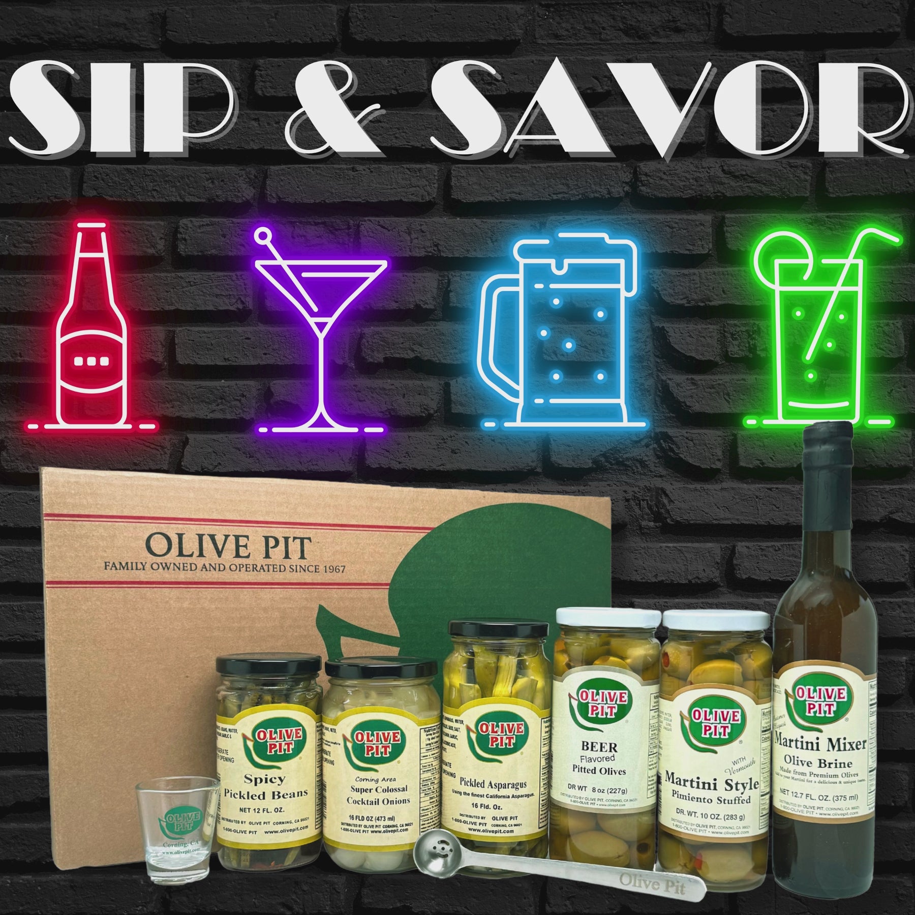 Includes: Martini Stuffed with Vermouth Pint, Beer Style Pitted Pint, Cocktail Onion Pint, Spicy Pickled Green Beans 12oz, California Pickled Asparagus Pint, Martini Mixer 12.7oz, Olive Pit Shot Glass, Stainless Steel Olive Spoon.